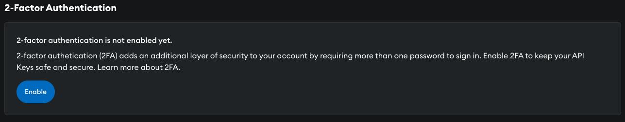 To enable 2FA authentication on your account, on the dashboard go to Settings -> Account, and select Enable.